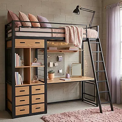 Кровать-чердак Маршал с встроенный рабочий стол — металлическая конструкция в стиле лофт от производителя TOPLOFT. Профильная труба 40×40 мм, сварной каркас, порошковое покрытие — любой цвет RAL. Освобождает до 4 м² жилой площади, верхний ярус выдерживает до 150 кг. Изготавливаем под ваши размеры, доставка транспортными компаниями по РФ.