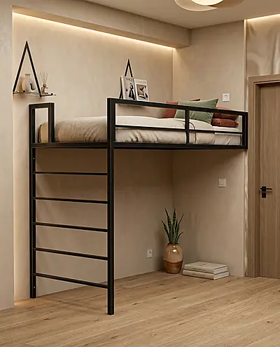 Кровать-чердак Монолит — металлическая конструкция в стиле лофт от производителя TOPLOFT. Профильная труба 40×40 мм, сварной каркас, порошковая окраска методом электростатики, любой RAL. Освобождает до 4 м² жилой площади, рассчитана на 150 кг — подходит для взрослых. Изготавливаем под ваши размеры, отправляем в любую точку России.