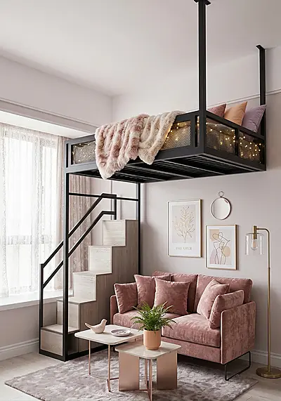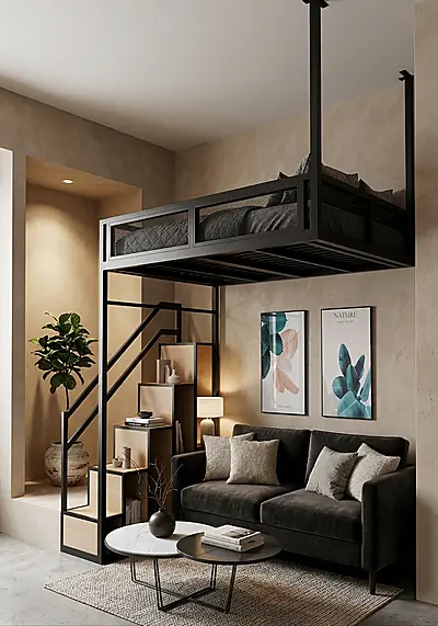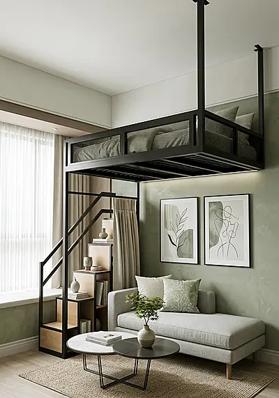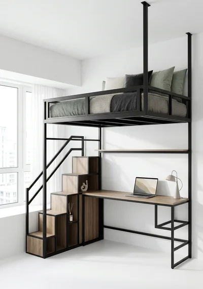 Кровать-чердак Апарт с встроенный шкаф, подвесное крепление — металлическая конструкция в стиле лофт от производителя TOPLOFT. Металл толщиной 2 мм, сварные швы без болтов, порошковое покрытие — любой цвет RAL. Освобождает до 4 м² жилой площади, верхний ярус выдерживает до 150 кг. Изготавливаем под ваши размеры, доставка транспортными компаниями по РФ.