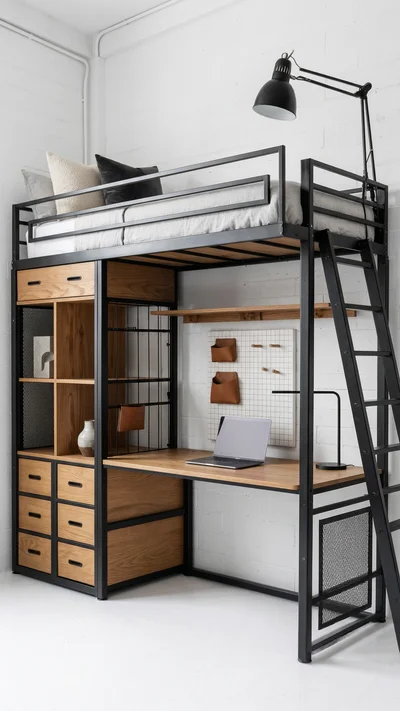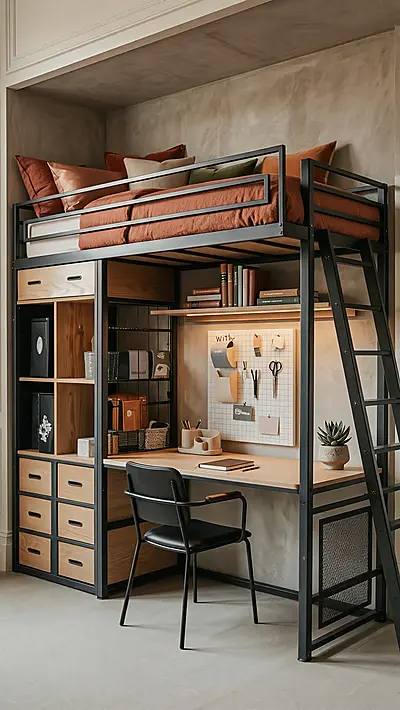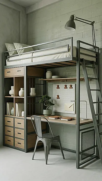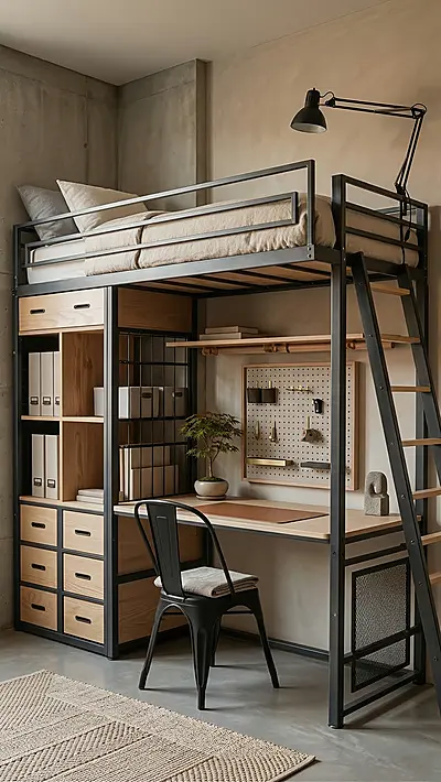 Кровать-чердак Метро с встроенный рабочий стол — металлическая конструкция в стиле лофт от производителя TOPLOFT. Профильная труба 40×40 мм, сварной каркас, порошковое покрытие — любой цвет RAL. Освобождает до 4 м² жилой площади, верхний ярус выдерживает до 150 кг. Изготавливаем под ваши размеры, доставка транспортными компаниями по РФ.