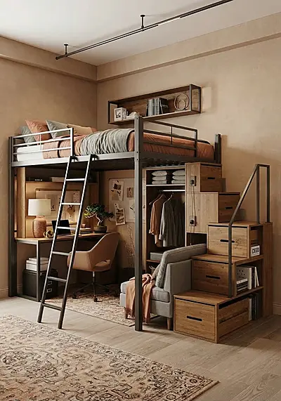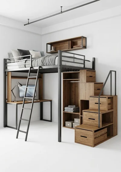 Кровать-чердак Тауэр с выдвижные ящики — металлическая конструкция в стиле лофт от производителя TOPLOFT. Сварная рама из профилированной стали, термоотверждаемое порошковое покрытие, палитра RAL. Освобождает до 4 м² жилой площади, несущая способность: 150 кг на спальное место. Изготавливаем под ваши размеры, доставка по всей России.